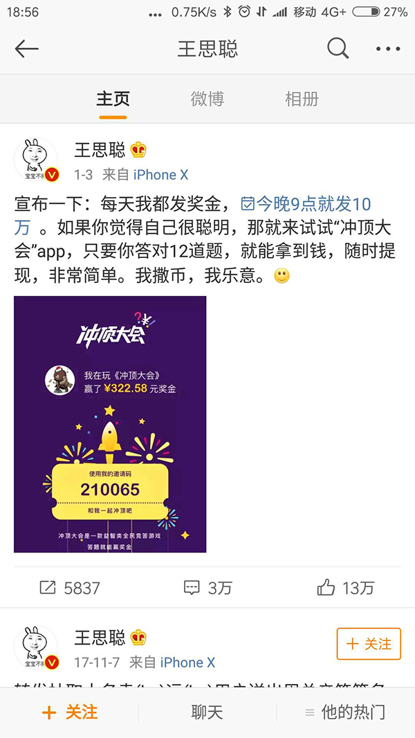 1月3日,王思聪30岁生日,发出了撒币宣言,为冲顶大会这家成立不到10天的app打了广告,号称要撒币10万,并表示“我撒币,我乐意。”