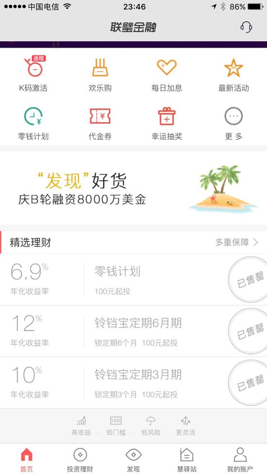 在联璧金融APP上,有“随存随取”“3个月定存”“6个月定存”三款主推理财产品,年化利率分别为6.9%、10%和12%。1月3日,这三款“标的”分别为“500万”和“700万”的理财产品已陆续被标注为售罄。从年化收益率来看,明显高于银行以及主流互联网金融平台。