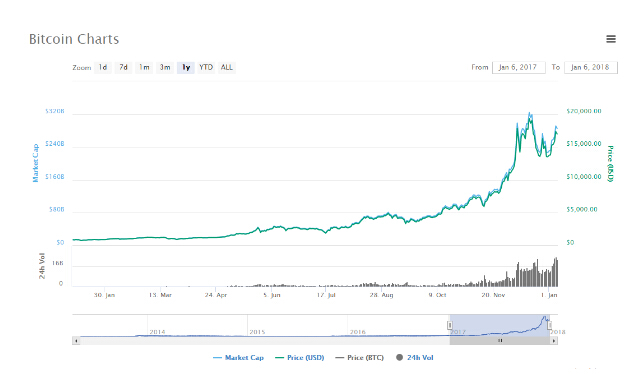 CoinMarketCap数据显示,在过去12个月时间里,比特币价格涨逾15倍,目前大约在17000美元附近,但是较19800的历史高点仍跌逾14%。过去数周,其他虚拟货币开始强势发力,整个虚拟货币市场的总市值达到约8000亿美元。