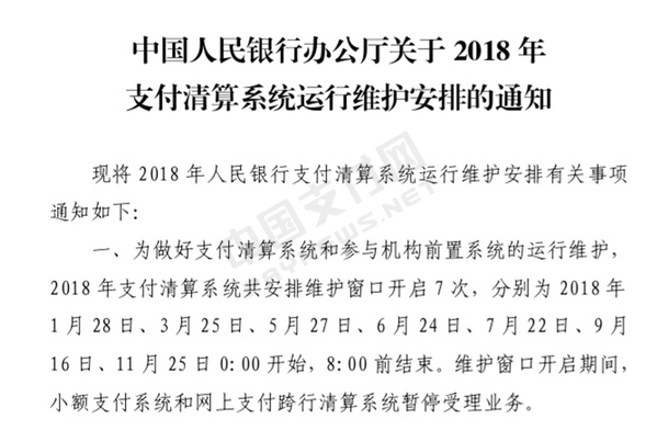 转载请标注:信息网——央行最新安排:2018年有7次转账不能实时到账