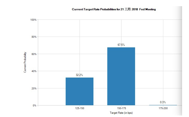 FOMC(联邦公开市场委员会)将2018年GDP增长率预测值从2.1%上调至2.5%。纪要表示:“大部分委员暗示,税改是他们提升未来几年美国GDP实际增长预期的一个因素。”会议纪要出炉之后,美联储3月加息25个基点至1.5%~1.75%区间的概率由61.9%升至67.5%,主流观点预计美联储2018年加息3次。