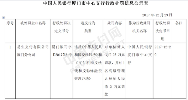 网络整理 2021-03-22 18:22中国人民银行厦门市中心支行2017年12月29日作出行政处罚,易生支付有限公司厦门分公司因“违反《中华人民共和国反洗钱法》和《支付机构反洗钱和反恐怖融资管理办法》”,被给予“对单位处人民币25万元罚款,并对1名高级管理人员处人民币2万元罚款”。