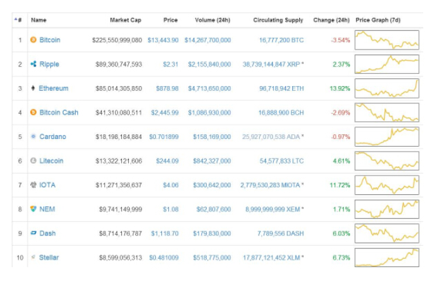 其他平台中,以太币也显示了同样的上涨趋势。据Coinmarketcap平台显示,目前以太币升至878.98美元,24小时内上涨13.92%。