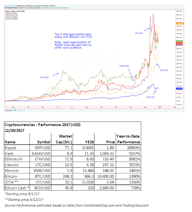 据Cointelegraph统计,截止2017年12月29日,瑞波币兑美元的价格2017年上涨28963%,位居第一。远远超过排名第二的Dash(9337%)、第三的以太币(8981%)。而比特币的涨幅虽然有1390%,也只能排名第六。