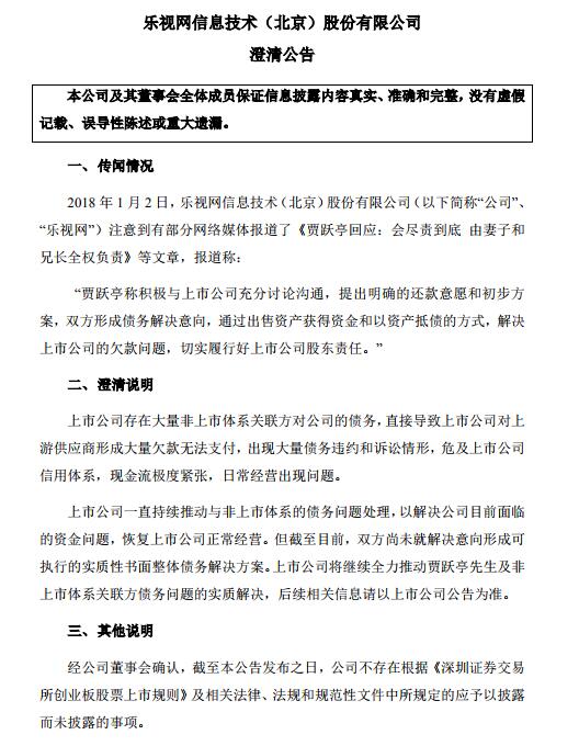 对此,乐视网就相关问题作出澄清,公司表示,上市公司一直持续推动与非上市体系的债务问题处理,以解决公司目前面临的资金问题,恢复上市公司正常经营。但截至目前,双方尚未就解决意向形成可执行的实质性书面整体债务解决方案。上市公司将继续全力推动贾跃亭先生及非上市体系关联方债务问题的实质解决。