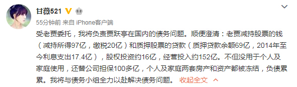 1月2日,贾跃亭妻子甘薇发布微博称:“受老贾委托,我将负责贾跃亭在国内的债务问题。顺便澄清:老贾减持股票的钱(减持所得97亿,缴税20亿)和质押股票的贷款(质押贷款余额69亿,2014年至今利息支出17.4亿),股权投资约16亿,经营投入约152亿。不但没用于个人及家庭使用,还替公司担保100多亿,个人及家庭两套房产和资产都被冻结,负债累累。我将与债务小组全力以赴解决债务问题。”