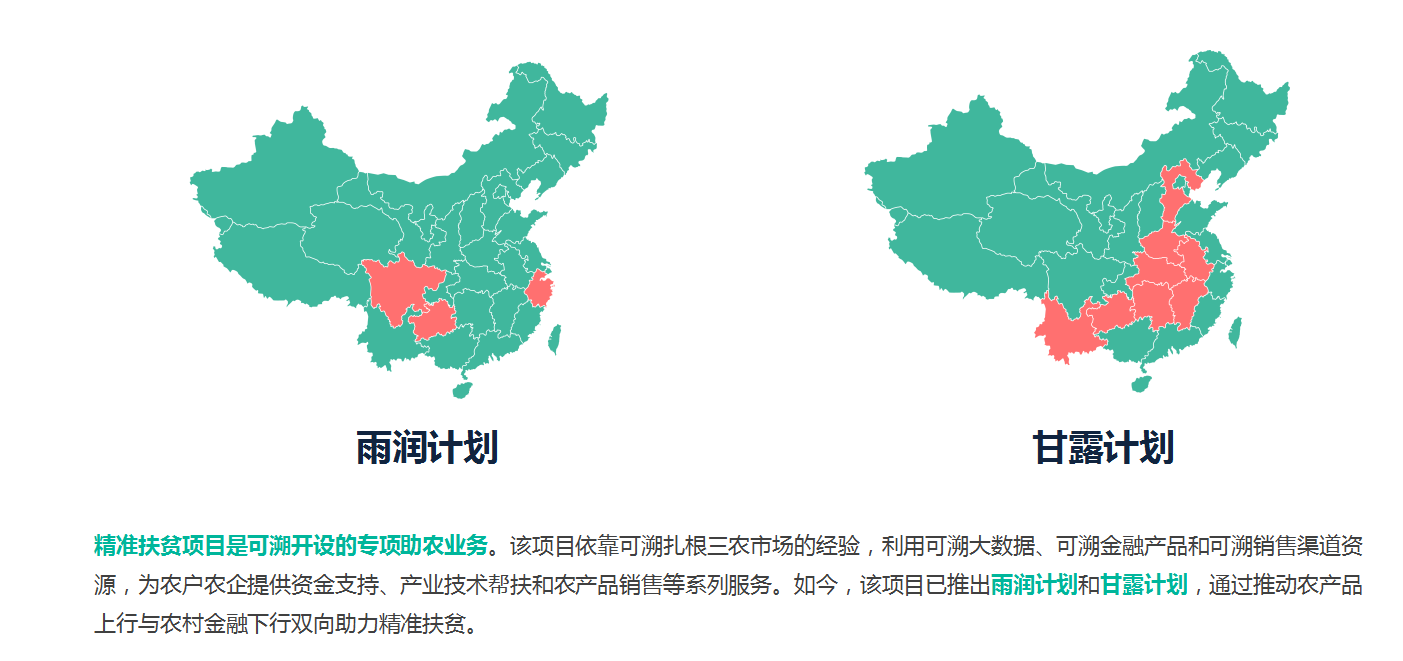 在金融扶贫的队列里,行业巨头固然有其优势,有其宏大的发展愿景,但专注于细分领域的中小金融平台,也是不可或缺的力量。相比于阿里京东,主张做“有温度金融”的可溯金融,则显得更加低调且务实,平台力推三大专项扶贫计划(甘露计划、雨润计划、思变计划),推出了“可溯生活”平台,重点打造农村电商。由此可见,互联网金融的发展,确实让金融扶贫有了更多的可能性。