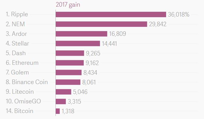 美国新锐媒体Quartz分析指出,比特币虽然在去年涨势亮眼,但论整体涨幅只能在全球数字货币领域排名第14位。涨幅最大的莫过于瑞波币,2017年价格累涨了360倍。