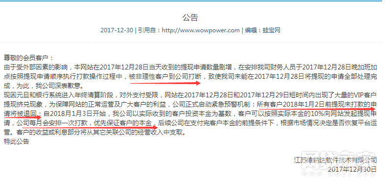 公告称,由于受外部因素的影响,本网站在2017年12月28日当天收到的提现申请数量剧增,在安排我司财务人员于2017年12月28日晚加班加点按照提现申请顺序执行打款操作过程中,被非理性客户到公司打断,致使我司未能在2017年12月28日将提现的申请全部处理完成。