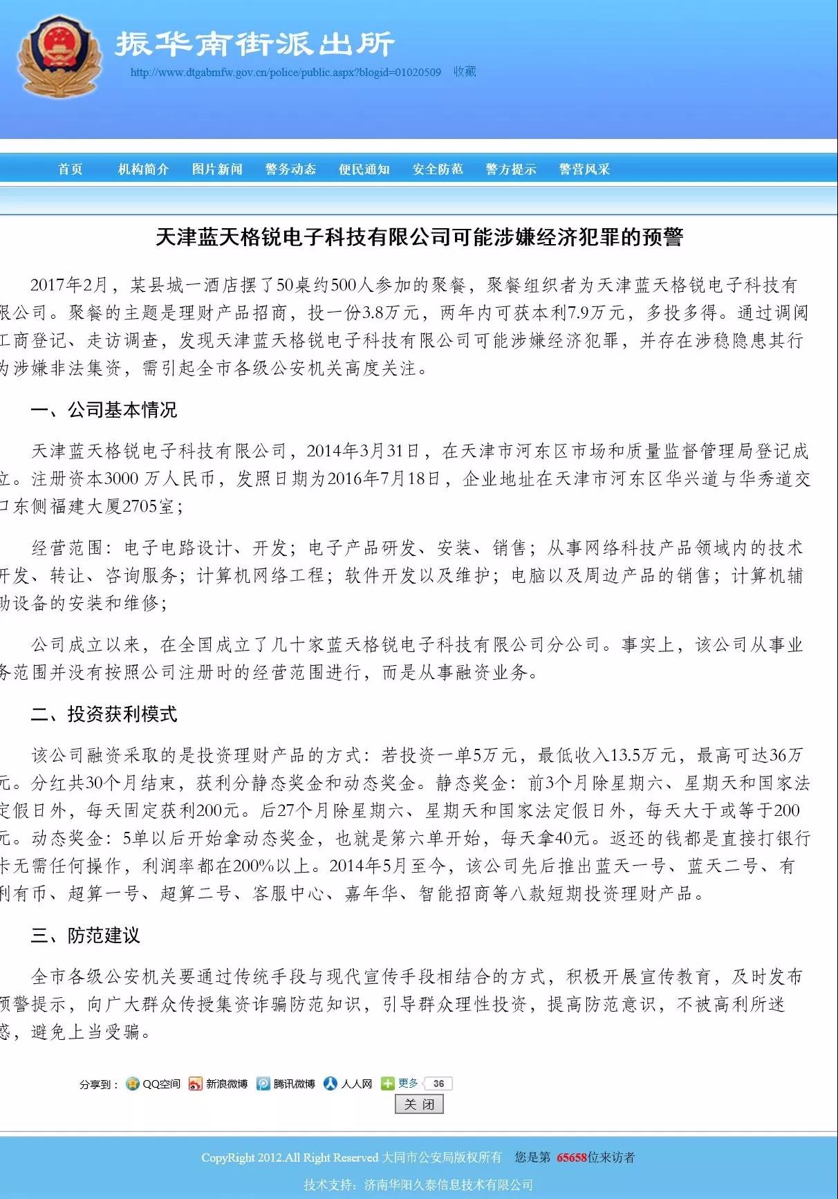 值得注意的是,今年8月,山西大同警方曾对于蓝天格锐涉嫌经济犯罪发出预警公告。