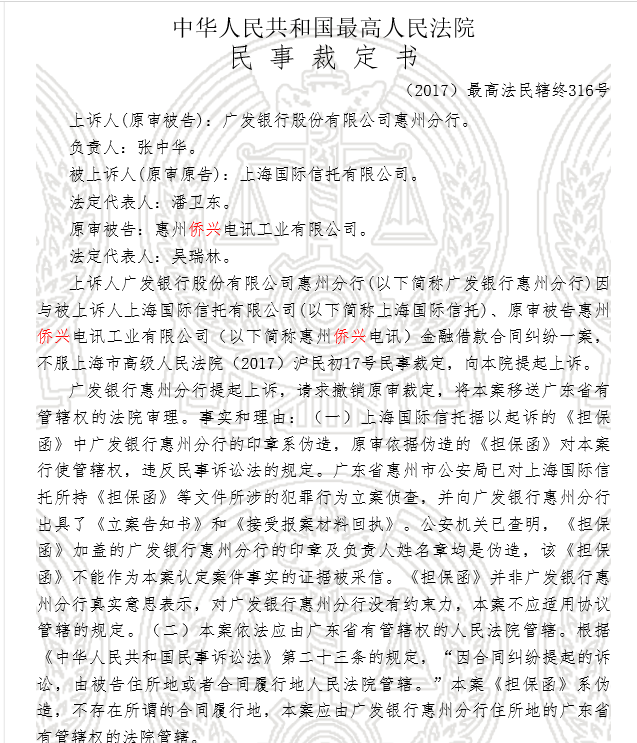 而最高人民法院审查认为,上海国际信托据以起诉惠州侨兴电讯、广发银行惠州分行的《信托贷款合同》和《担保函》中约定有管辖条款。广发银行惠州分行提出《担保函》系伪造,已涉嫌刑事犯罪;广发银行惠州分行提交了《接受报案材料回执》和《立案告知书》,证明公安机关已就侨兴集团伪造广发银行惠州分行合同用以骗取中国邮政储蓄银行北京分行贷款一案立案侦查;上述《担保函》的效力存疑属于实体审理问题。上诉人上诉理由不足,本案涉及系统性区域性金融风险系列案件,上海市高级人民法院不宜行使本案管辖权。