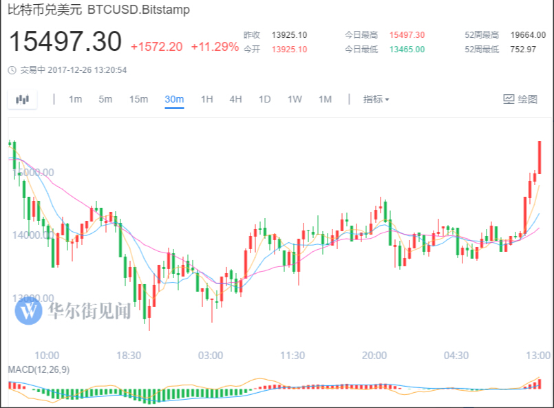 交易平台Bitstamp报价显示,截止发稿,比特币报15497.30美元,日内累计涨超1500美元,涨幅超11%。