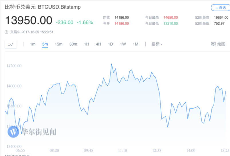 比特币今日下跌3.8%,至13703美元。这意味着比特币已经连跌5日。而因为圣诞假期的缘故,美国的交易所今日大都暂停了交易。目前,比特币已经较高位回落约30%。