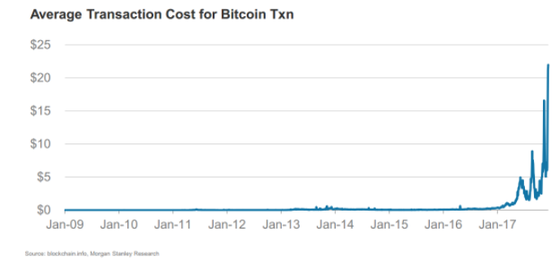 比特币的交易成本随着比特币价格的飙升也水涨创高: