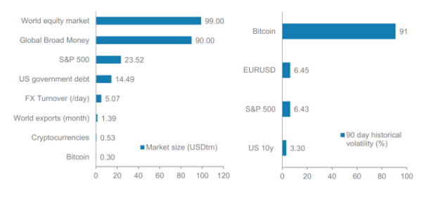 大摩还在报告中总结了比特币的其它一些特殊。例如,和其它市场和资产相比,比特币规模相对较小,但波动率惊人: