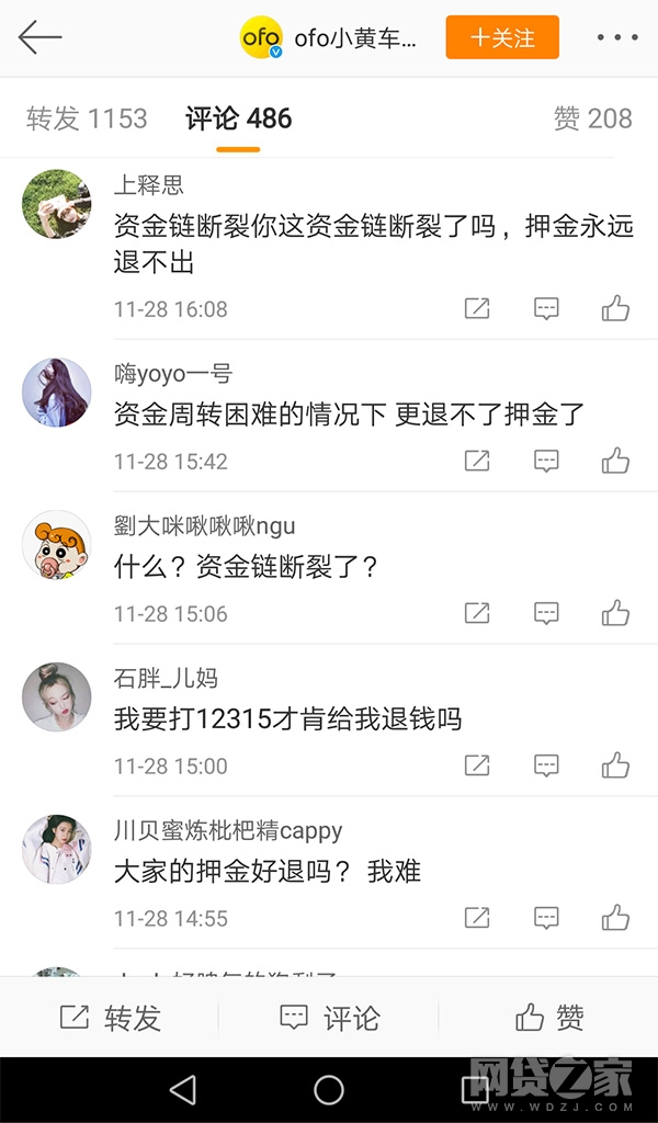 OFO官方微博评论区有用户反映押金难退