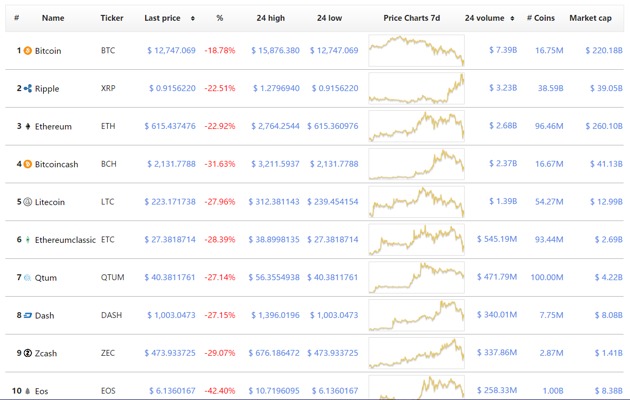 网络整理 2021-03-22 18:32北京时间12月22日,数字货币全线大跌,以太坊、比特币现金、莱特币均跌超20%。比特币交易平台Bitstamp报价显示,比特币跌破13000美元关口,日内跌17%。比特币的这波跌幅已超过30%。