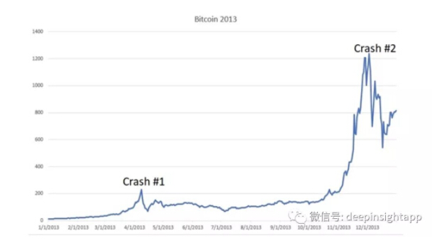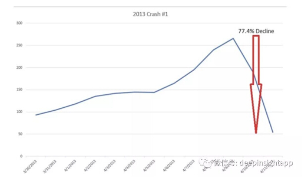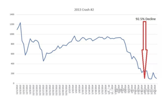 接下来则是2013年的Crash2,也是比特币历史上最毁灭财富的一次下跌。之前我说过,2013年比特币的暴涨开始吸引大量的“人民币玩家”入场。甚至开玩笑的说,中国大妈开始入场扫货了,带动了2013年那波比特币的“主升浪”。但是到了12月5日,以中国央行为首的监管部门联合印发《关于防范比特币风险的通知》(以下简称“《通知》”),明确指出比特币不是货币,不应作为货币在市场上流通使用,普通民众在自担风险的前提下拥有参与的自由,各金融机构和支付机构不得以比特币为产品或服务定价。这个通知也导致了比特币出现了历史上最大一次暴跌:在83天之内,比特币价格暴跌92.5%,几乎毁灭了这个市场。