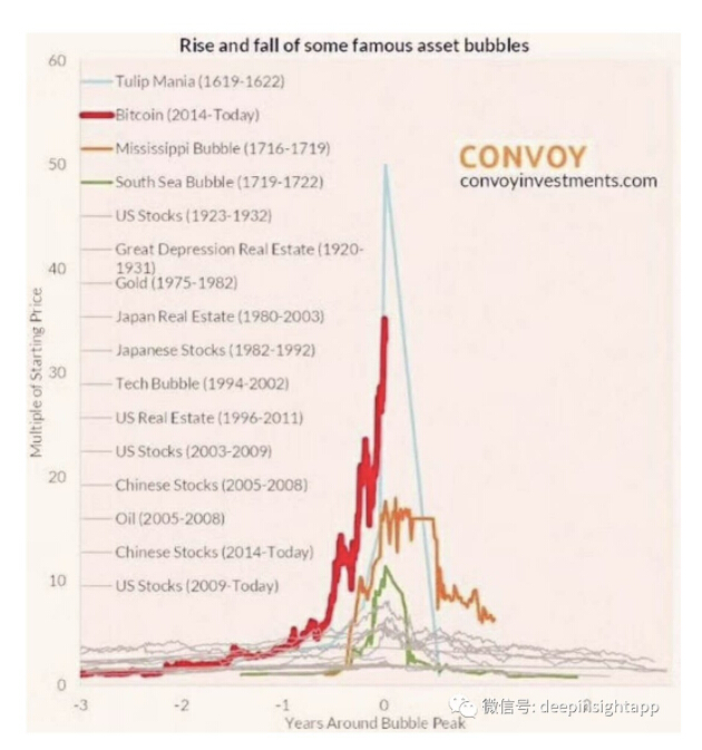 最后,当然是下面这张图。许多人把比特币看做历史上最大的一次资产泡沫,能够和其对比的只有当时的郁金香泡沫。当然,也可能我们的视野不够开阔,无法看到比特币的价值。看空,看多都有其理由,没有必要做过多争论。通过对于比特币几次泡沫的分析,我们看到这个资产波动率非常大,而且也出现过比较长的熊市。如果对于基本面认知不够,建议不要过多参与博弈。