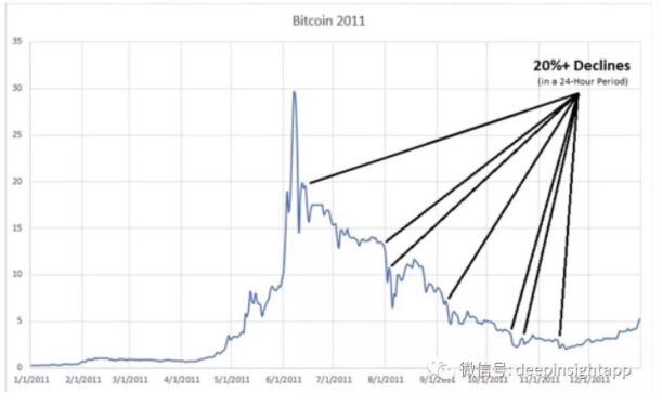 2011年开始的时候,比特币还只有0.3美元/币,到了6月8日那天触达到了31.5美元/币,在半年不到就取得了105倍的涨幅。然后不到一个月的时间内,比特币就暴跌到了11美元/币,再过了一个月不到又下跌到了7.8美元/币,然后继续回落到4.77美元/币。也就是说,在90天的时间内,比特币暴跌了85%。