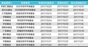 不过,证监会公示的基金募集申请核准信息显示,货币基金的受理和审查并未停止。目前共有华夏、易方达、博时、广发等10家公募上报了12只货币基金,这些货币基金皆已获得受理,其中11只也已进入审查阶段。但从获批的情况看,最近一次获批的是今年8月25日的博时合丰货币市场基金。