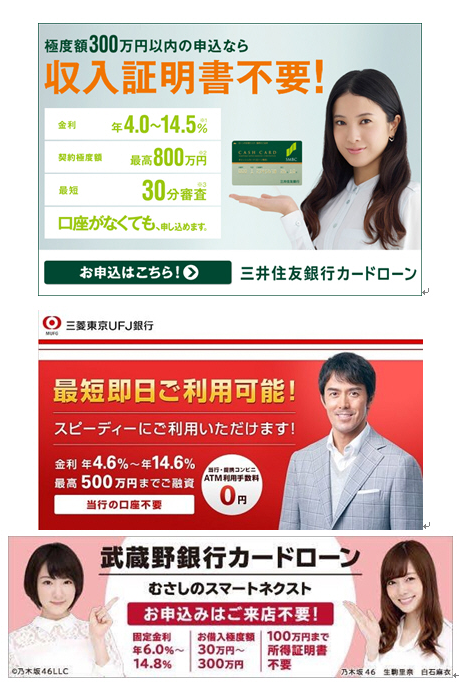 近期,“现金贷”在中国饱受争议,监管政策也纷至沓来,但你可能想不到,上述广告就是日本三大银行之一的三井住友银行的现金贷广告。此外,其他两大银行——三菱东京UFJ、瑞穗金融集团都曾请当红影视男星阿部宽、福士蒼汰,当红女团乃木坂46作为代言人,且会根据明星的热度来不断更换人选。
