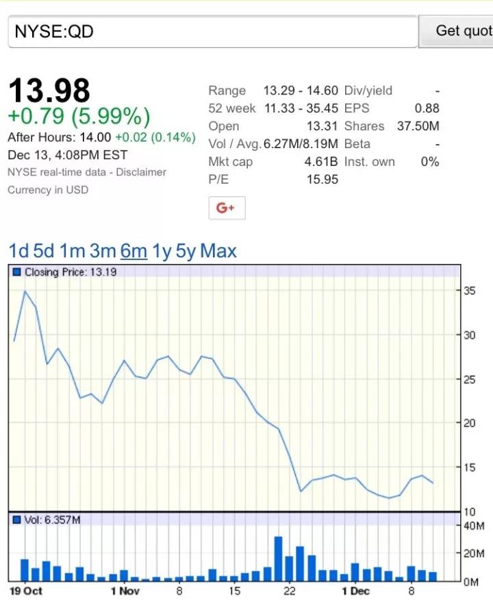 网络整理 2021-03-22 18:38下图是趣店10月IPO 来到目前的股价趋势图,该公司IPO 之后的最高股价曾经到35.45美元,对应的最高市值约110亿美元;而这个短短的不到两个月期间,最低的股价是11.33,不仅远低于IPO 24美元的价格,和最高价格比较,缩水超过七成;投资者损失惨重。
