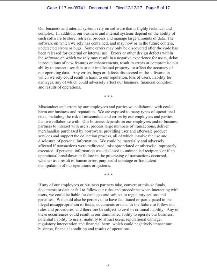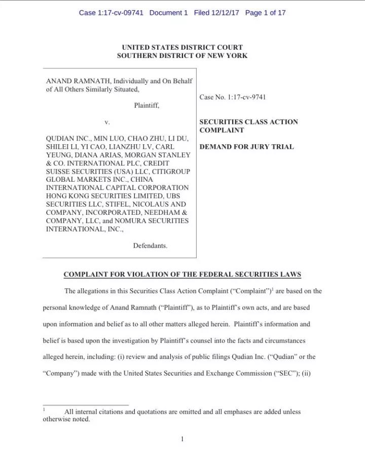 股价的暴跌,接着就是华尔街“诉棍”开始围攻趣店。据媒体报道,至少有三家华尔街律所打算发动对趣店的集体诉讼。2017年12月12日,诉讼正式爆发。以下是刚刚提交的诉状。被告不仅仅包括趣店公司,公司董事会成员、CEO 和CFO;还包括IPO的所有投行承销商,其中包括:大摩 、瑞银、花旗、中金等等。