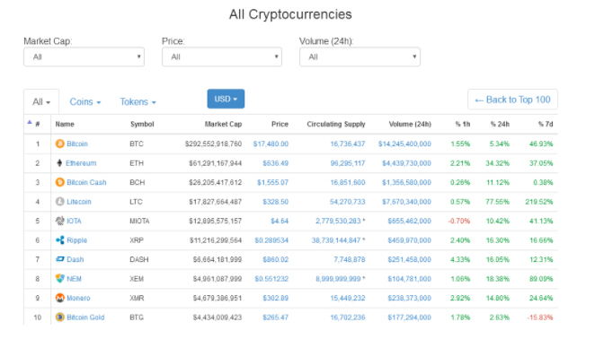 Coinmarketcap前十大数字货币报价(截至2017.12.13凌晨0:30)