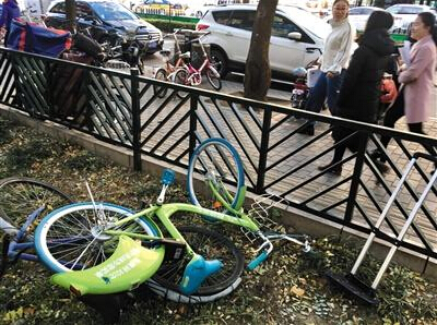 11月14日,一辆酷骑单车被遗弃在花坛里。酷骑单车频现押金退款难引发消费者集体维权。新京报记者浦峰摄