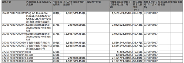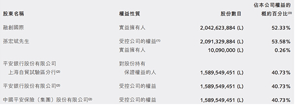 在融创中国2017年半年报中显示,截至6月30日,孙宏斌持有融创53.84%的股权,平安银行、平安银行上海自贸试验区分行和平安保险集团持有融创40.73%的股权。