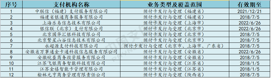 这12家持牌的支付机构分别是:中联信(福建)支付服务有限公司、福建省银通商务服务有限公司、上海乐易信息技术有限公司、银信联(北京)支付有限公司、北京国华汇银科技有限公司、北京繁星山谷信息技术有限公司、永超源支付科技有限公司、安徽省万事通金卡通科技信息服务有限公司、安徽皖垦商务投资服务有限公司、江苏飞银商务智能科技有限公司、江苏金禧智能卡管理有限公司、榆林元亨商务管理有限责任公司。