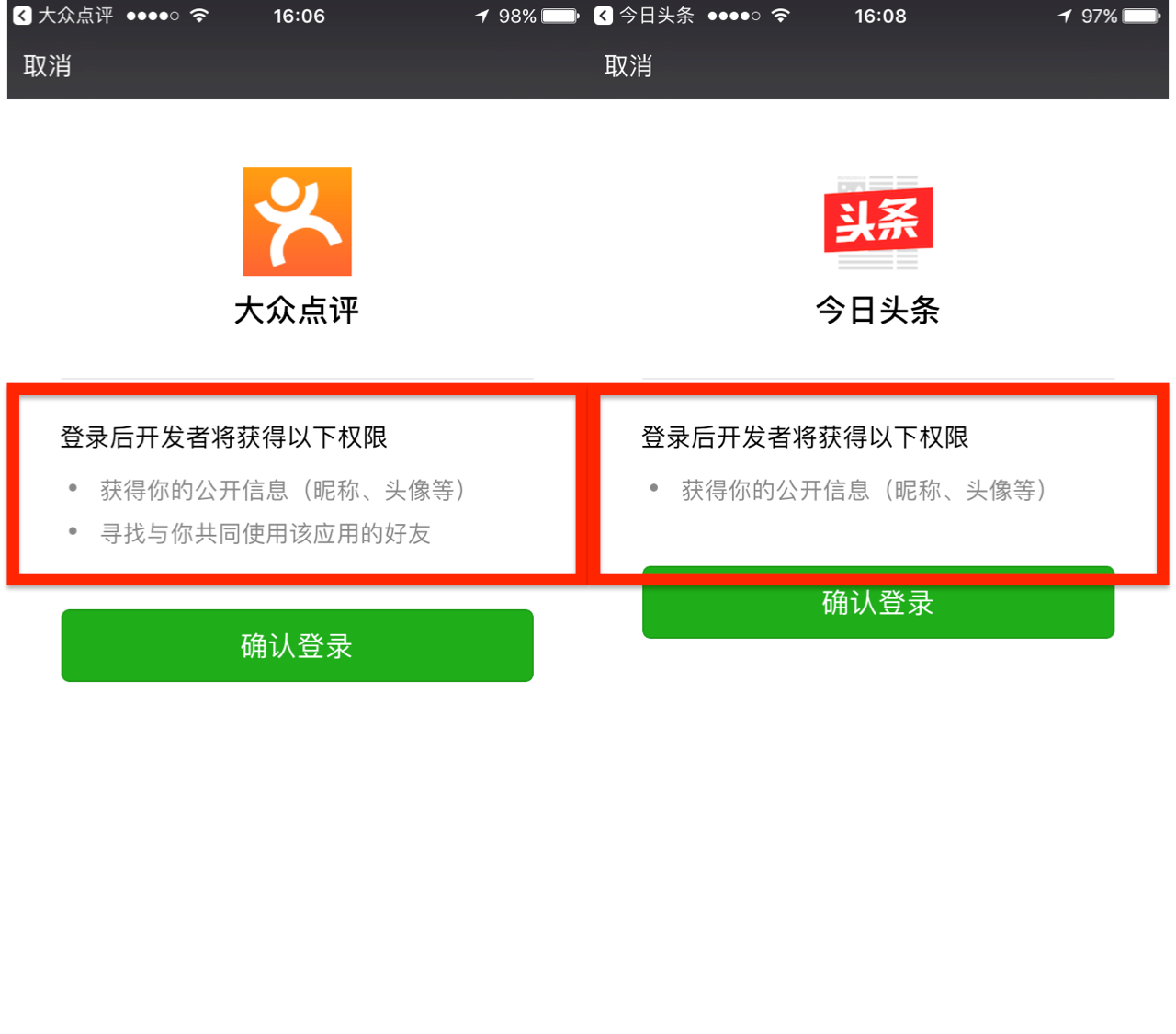 蓝鲸财经按照微博曝料的内容尝试分别用微信账户登录了腾讯系的大众点评和非腾讯系的今日头条后发现,登录页面上二者确实有差别。在大众点评的登录页面上,写着登录后开发者将获得“寻找与你共同使用该应用的好友”的权限,今日头条则没有。用户如果要登录,必须选择接受,没有否的选项,甚至也不能只选择其中一项,也就是说用户不得不将微信的好有关系链给予这些腾讯系的公司,并没有选择权。