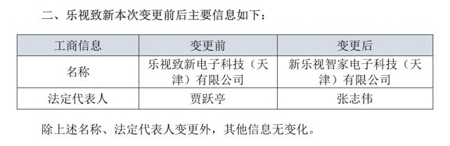 除了名称变更,新乐视智家(原名:乐视致新)的法定代表人由贾跃亭变更为了CEO张志伟。