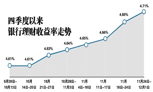 银行理财收益率继续刷新年内高点。据普益标准发布的数据,今年四季度以来,封闭式预期收益型的银行理财收益率不断走高,每周涨幅在0.01-0.03个百分点,11月下旬开始增速加快,至上周末累计上涨0.1个百分点。