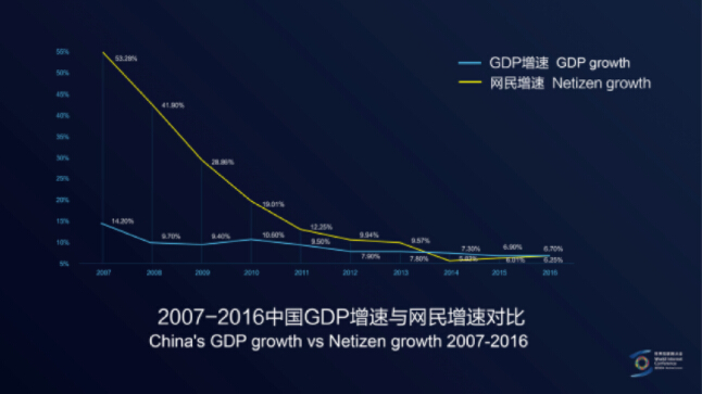所以,请大家先看一张图。这张图是过去十年,中国互联网网民的成长速度和中国GDP成长速度的比较图。我们看到,十年前中国互联网网民成长在50%以上,到今天其实到了6%左右。事实上,过去的四年,中国互联网网民的成长速度都已经慢于中国GDP的成长速度了。这意味着什么呢?意味着互联网的人口红利没有了。所以去年我在这里说“无线(移动)互联网已经结束了”,大多数人都不同意,很多人讲,没有结束、只是进入了下半场。今年我看到,原来讲“下半场”的人都开始讲人工智能了,所以我的下一页PPT也给大家讲一讲人工智能。