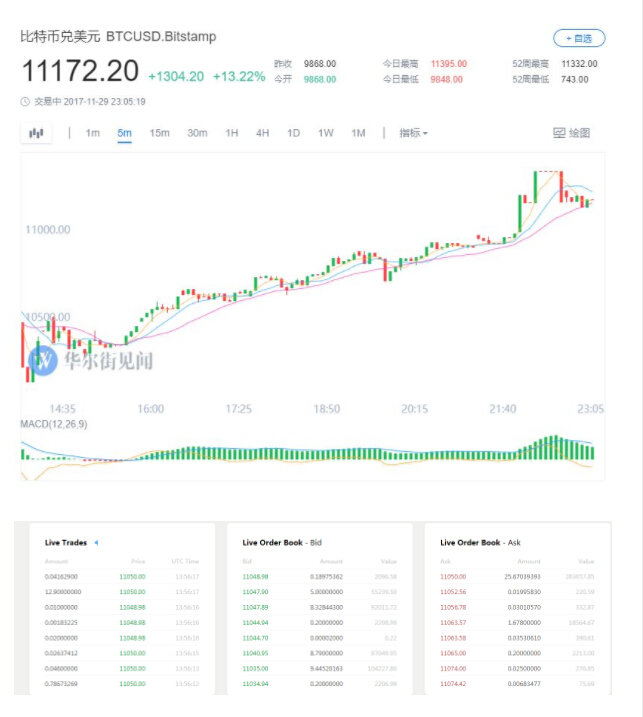 此前,北京时间周三晚10点,CoinDesk、Bitstamp和GDAX等多个比特币平台报价显示,比特币兑美元突破11000关口。Bitstamp数据显示,其价格再创历史新高至11395美元。