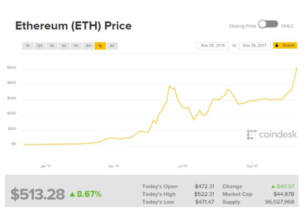CoinDesk数据显示,以太币也在周三创新高至522.31美元,市值近500亿美元,今年以来累涨6700%。比特币现金交投于1650美元,但远离11月12日所创1950美元的历史新高。