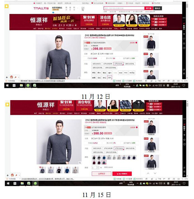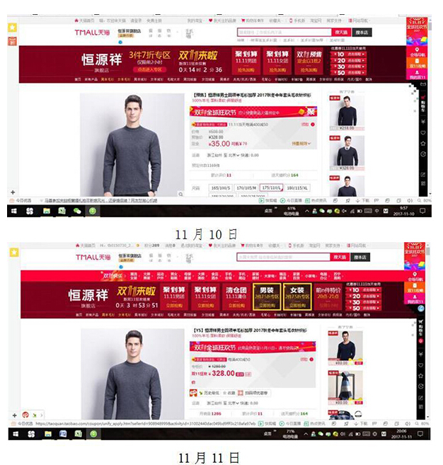 电商平台和商家天猫平台的某款标称为“恒源祥”品牌针织衫11月10日、11月12日、11月15日的划线价格均为508元,但11月11日划线价格调整为专柜价1280元。但专柜价说法仅在11月11日的商品页面显示,并未连续出现,也未标明出处,消费者若只看到11月11日当日价格,会因优惠力度大而被误导消费。
