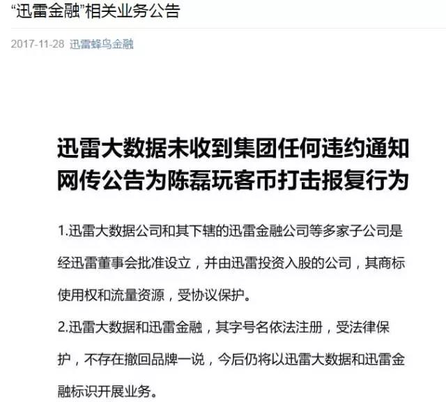 值得一提的是,迅雷公告发布后,迅雷大数据公司紧急通过“迅雷蜂鸟金融”公众号发布公告称,“迅雷大数据未收到集团任何违约通知,网传公告来源于迅雷CEO陈磊,是其打击报复迅雷大数据公司不愿在陈磊开展的玩客币违法违规活动中同流合污的单方面行为,并不是迅雷集团按照公司治理规程审慎决策后的违约表示。”