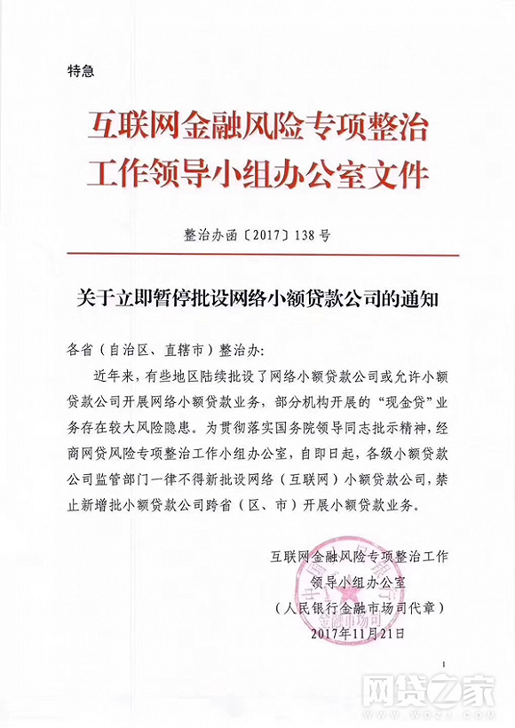 昨日,央行互联网金融风险专项整治工作领导小组办公室下发特急文件《关于立即暂停批设网络小额贷款公司的通知》,正式宣告此前身价已经水涨船高的互联网小贷牌照的暂停发放。该文件称,“近年来,有些地区陆续批设了网络小额贷款公司或允许小额贷款公司开展网络小额贷款业务,部分机构开展的‘现金贷’业务存在较大风险隐患”,决定自即日起,各级小额贷款公司监管部门一律不得新批设互联网小额贷款公司,禁止新增批小额贷款公司地区开展小额贷款业务。