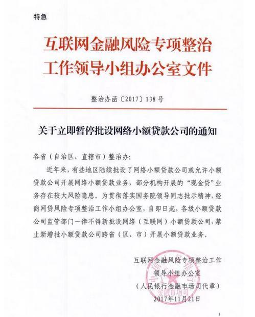 网络整理 2021-03-22 19:002017年11月21日,一纸标注“特急”的文件下发到各省(自治区、直辖市)的整治办(互联网金融风险专项整治工作领导小组办公室的简称),网络小额贷款公司(下称,网络小贷)的审批被叫停。
