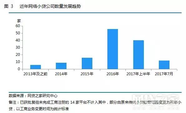 从时间上来看,在2013年及以前,全国范围内被准许在互联网上开展业务的小贷公司不超过10家。从2014年开始,网络小贷公司数量开始逐年增加,仅2016年一年,全国就冒出了近60家。