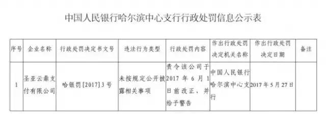 值得一提的是, 5月27日,中国人民银行哈尔滨中心支行对圣亚云鼎作出行政处罚原因是“未按规定公开披露相关事项”,这也是首家因“未按规定公开披露相关事项”被处罚的支付机构。