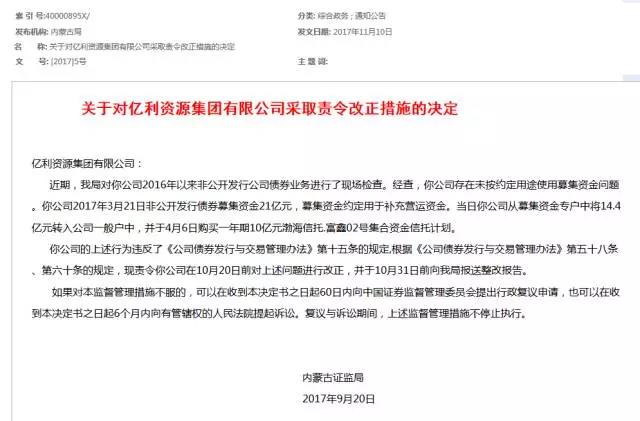 今年9月亿利集团曾因为违规使用募集资金,遭内蒙古证监局责令改正。具体情况竟然是亿利集团非公开发行债券募集资金21亿,号称用于补充营运资金,却当日就将其中的14.4亿转到公司一般户并购买了10亿的渤海信托富鑫02号集合资金信托计划。