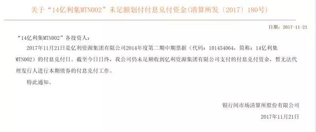 网络整理 2021-03-22 19:0011月21日晚间,银行间市场清算所股份有限公司(下简称“上海清算所”),发布消息称,11月21日是亿利资源集团有限公司(下简称“亿利集团”)2014年度第二期中期票据“14亿利集MTN002”的付息兑付日,截至日终,仍未足额收到亿利集团支付的付息兑付资金,暂无法代理发行人进行本期债券的付息兑付工作。