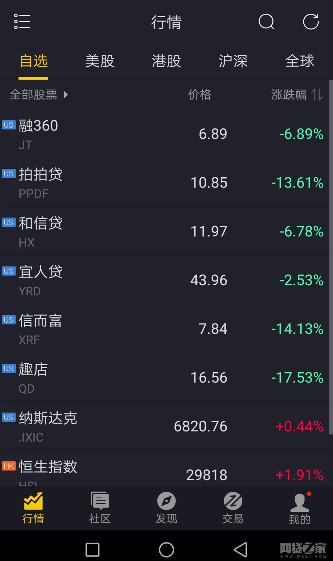 美股中国互金类股票盘前大跌,来源:老虎证券(图中灰色部分为盘前跌幅)