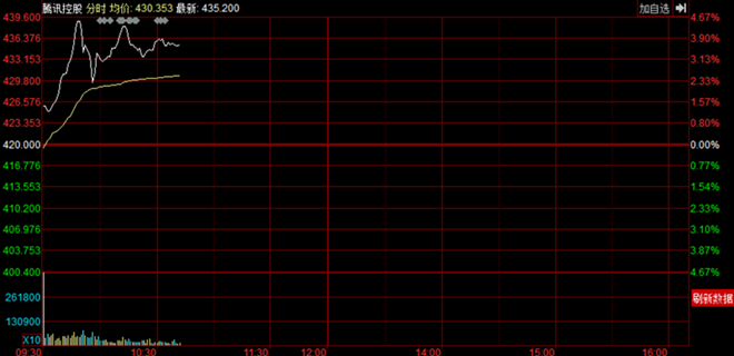 网络整理 2021-03-22 19:03连续三个交易日大涨后腾讯今早继续高开高走,盘中股价一度达到430.2港元,涨幅为2.43%,市值首度超过facebook,达到40864亿港元(约合5231亿美元),成为全世界市值第5高的公司,前4位分别是苹果、谷歌、微软、亚马逊。