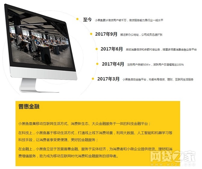 网贷之家从小黑鱼科技官网获得信息显示,小黑鱼是集移动互联网生活方式、消费新生态、大众金融服务于一体的科技金融平台,在金融上,小黑鱼立足于发展普惠金融、服务于实体经济,为消费者和小微企业提供信贷、理财和消费增值服务。