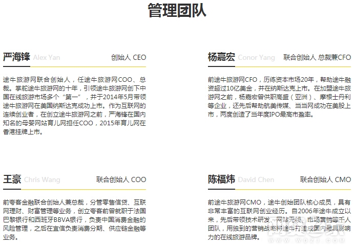 根据小黑鱼科技官网的介绍,除了严海锋之外,公司总裁杨嘉宏、COO王豪、CMO陈福炜均为联合创始人。其中,杨嘉宏前途牛旅游网CFO,王豪为前夸客金融联合创始人兼总裁,陈福炜为前途牛旅游网CMO,亦是途牛创始团队核心成员。